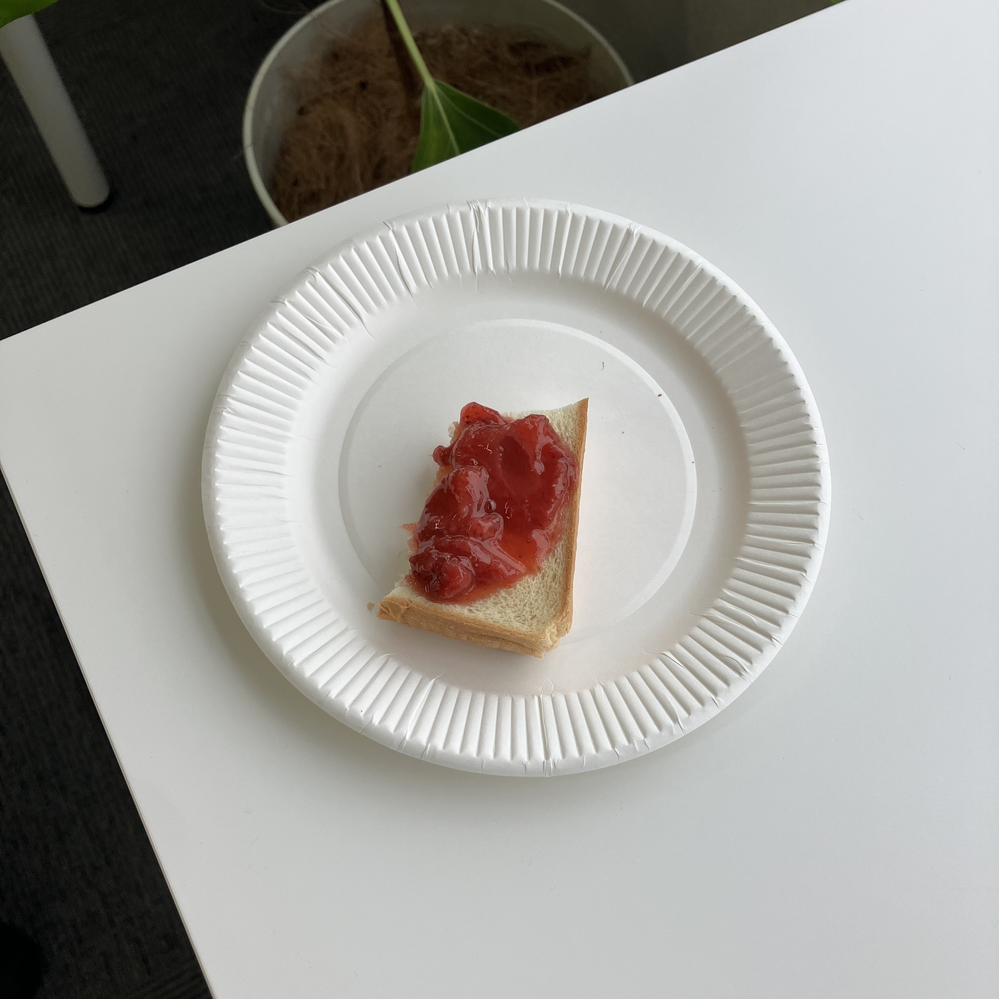 次は、特製ジャムをのせてもう一口。 添加物なし、果物の甘酸っぱさそのまま。 外はさっくり、中はもっちりのトーストと合わさると——